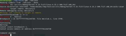 カーネルをgdbでリモートデバッグできるようにするかーとか思ってやってたわけです。 しかし、下記のような感じでちょっとハマってました。 ブレークポイントが効かなかったり vmlinuxとvmlinuzの組が合ってるのにシンボル名が出なかったり Cannot access me…